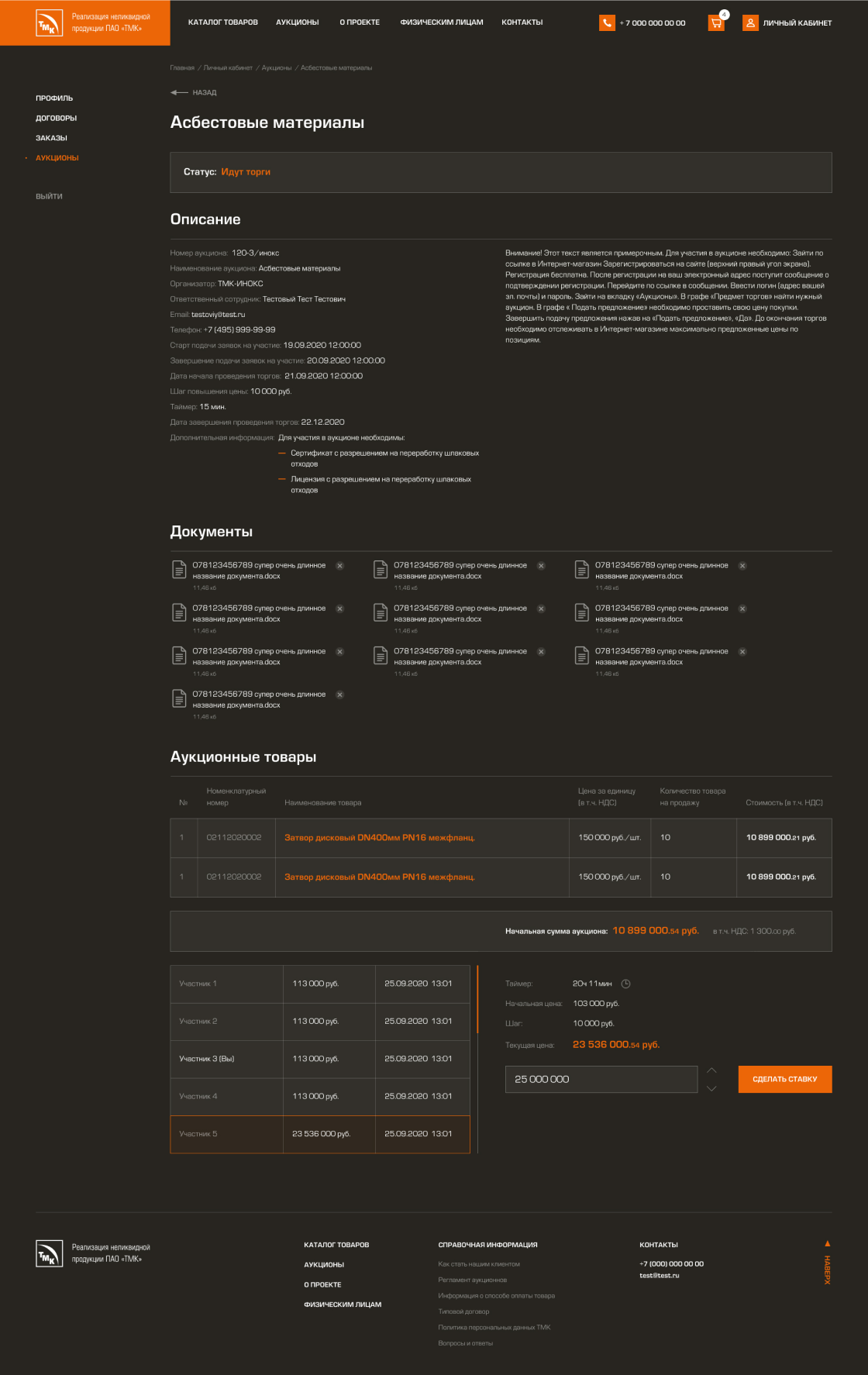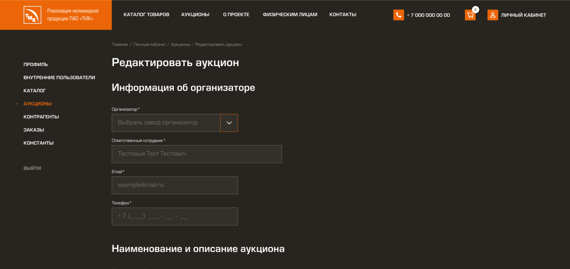 • Менеджеры заводов, в личном кабинете, запускают аукцион по продаже нелеквидной продукции своего завода. Для этого им требуется установить правила и сроки проведения аукциона, минимальную стоимость лотов и кратность ставок. Также организатор аукциона может потребовать прикрепление необходимых документов для участия в торгах.