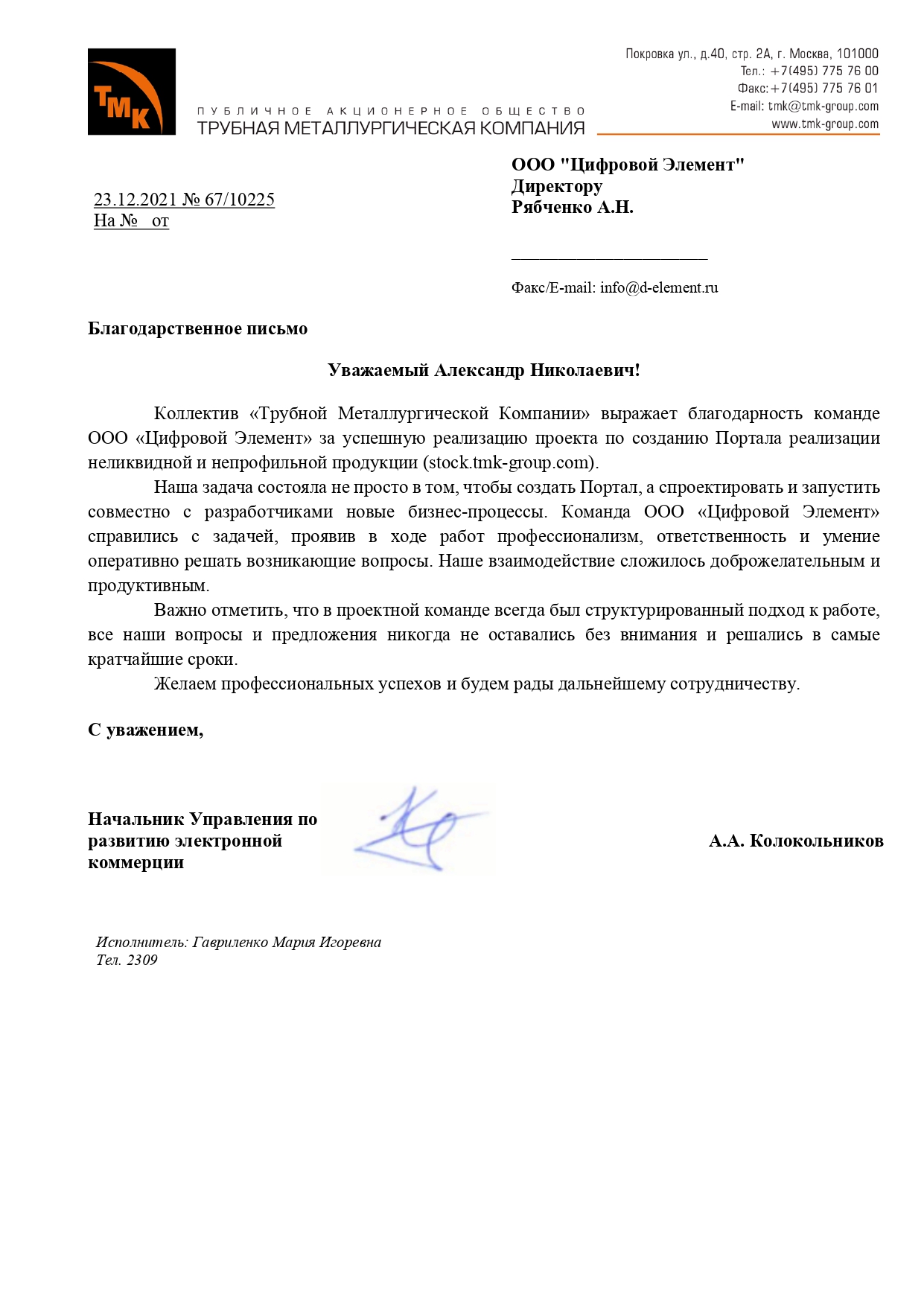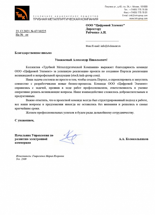 Коллектив «Трубной Металлургической Компании» выражает благодарность команде ООО «Цифровой Элемент» за успешную реализацию проекта по созданию Портала реализации неликвидной и непрофильной продукции. Наша задача состояла не просто в том, чтобы создать Портал, а спроектировать и запустить совместно с разработчиками новые бизнес-процессы. Команда ООО «Цифровой Элемент» справились с задачей, проявив в ходе работ профессионализм, ответственность и умение оперативно решать возникающие вопросы.